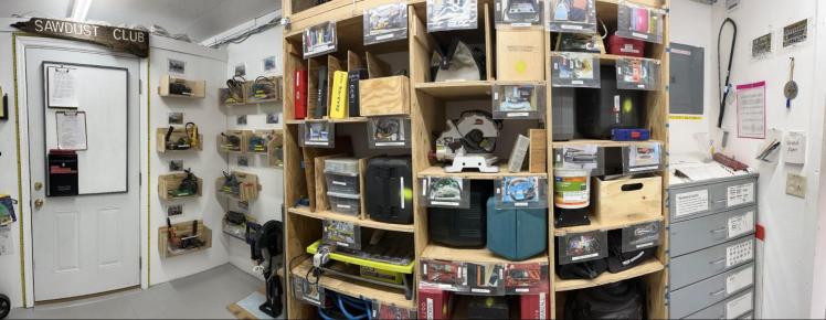 A wide variety of tools and supplies are available to borrow from the shop; such as, various saw types, hammers, wrenches, drills, nail guns, sanders, air compressor, ladder, floor jack, gardening tools, etc. These are found in the Loaner tool room and other designated areas that are clearly marked (Membership Loan Program). All tools available for loan shall have been marked with fluorescent green paint. Tools can be borrowed for up to 48 hrs.